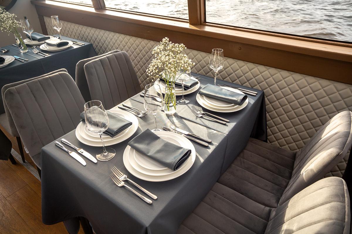 Теплоход отлично подходит для морских прогулок и проведения мероприятий любого формата. Классический интерьер, много пространства для общения и высокий уровень сервиса — все это мы предлагаем нашим клиентам.