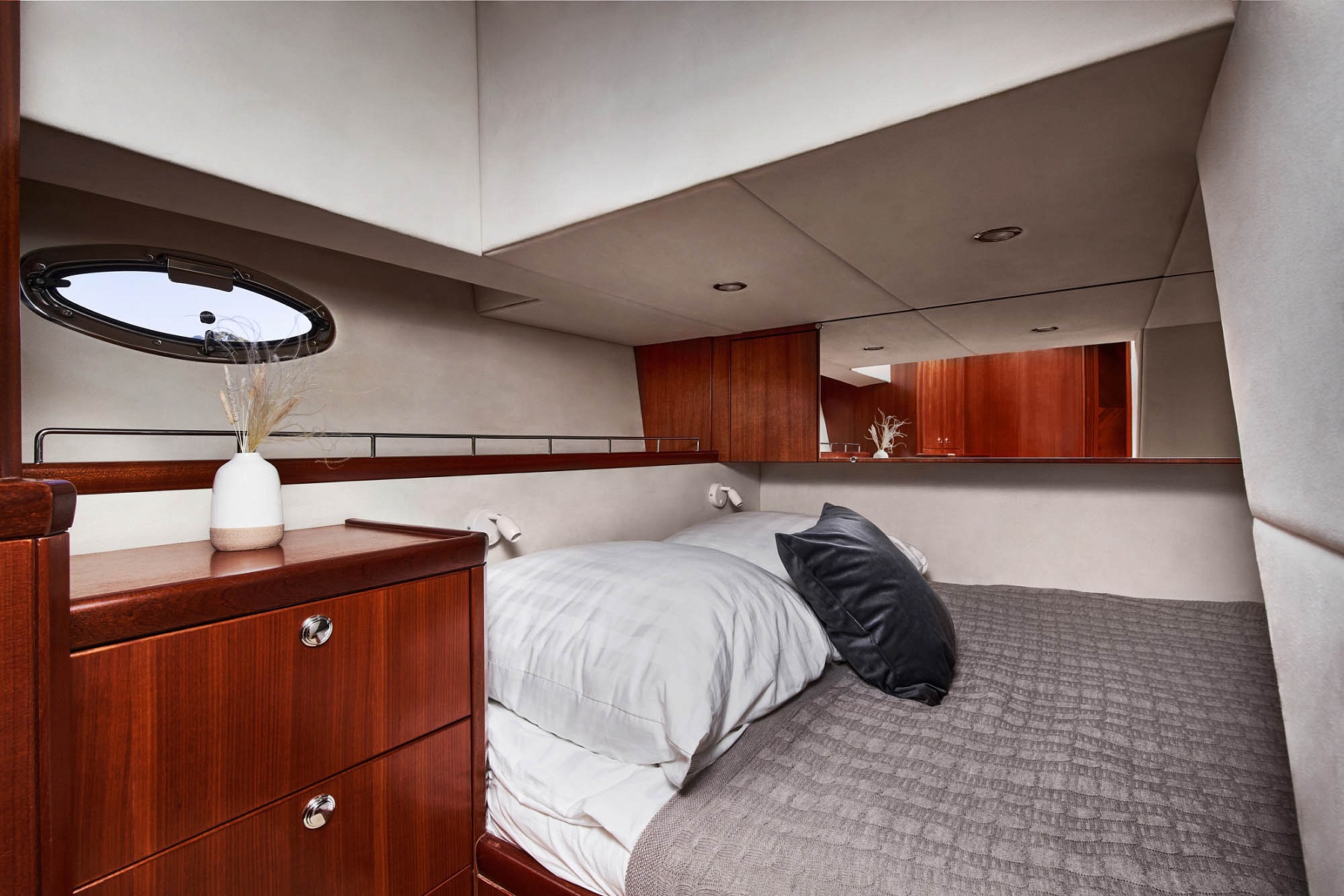 Просторная кают-компания с мягкими диванами и столиками, три уютные каюты с шестью спальными местами — всё это создаёт идеальные условия для отдыха в кругу близких людей. На борту есть кухня с полным набором посуды, уборная с душем и зарядки для устройств, чтобы всегда оставаться на связи.