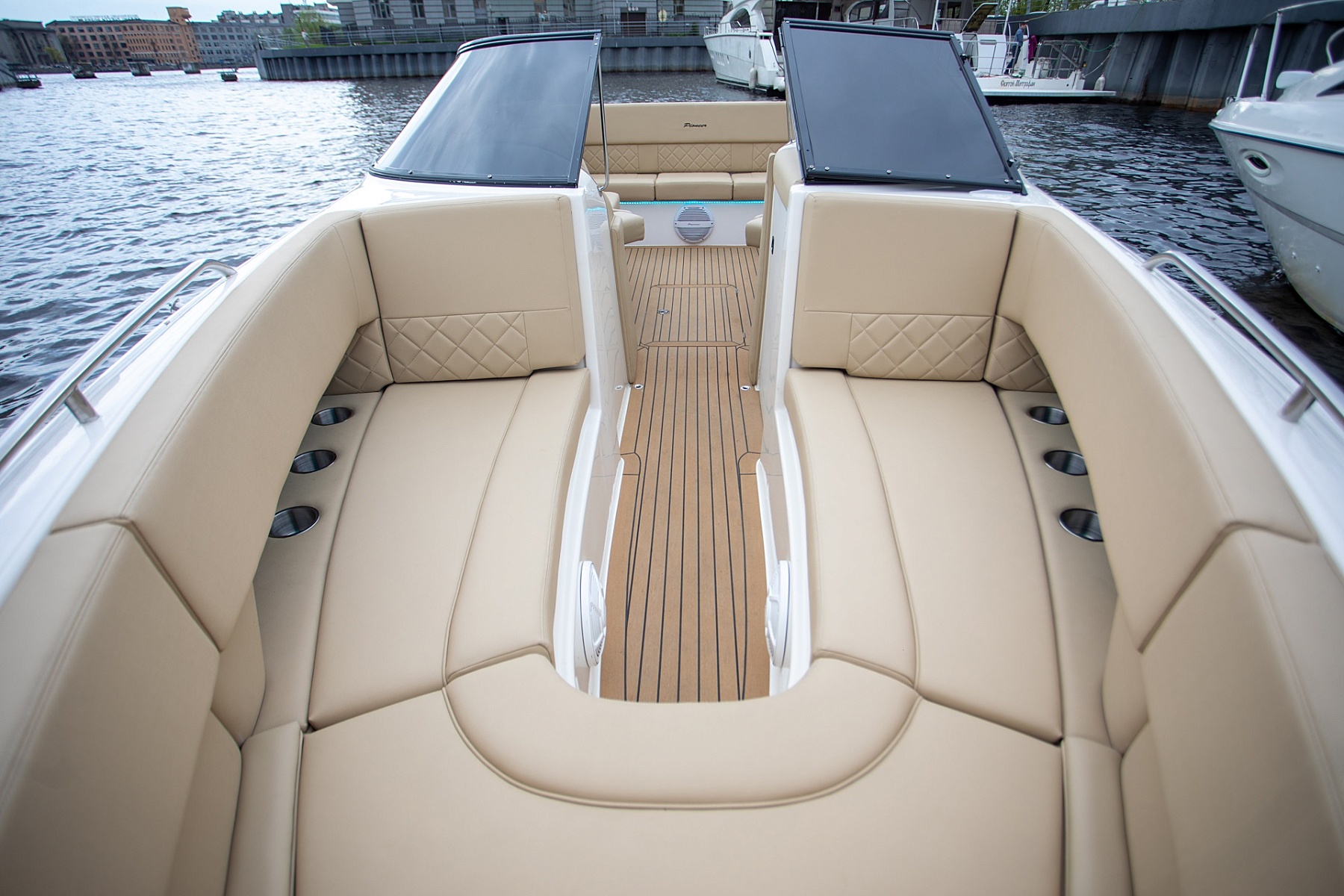 Катер «Пионер» — это идеальное сочетание стиля и комфорта. Дизайнерский интерьер с кожаным салоном создает атмосферу роскоши, а открытая зона на носу приглашает вас насладиться свежим воздухом и живописными видами.