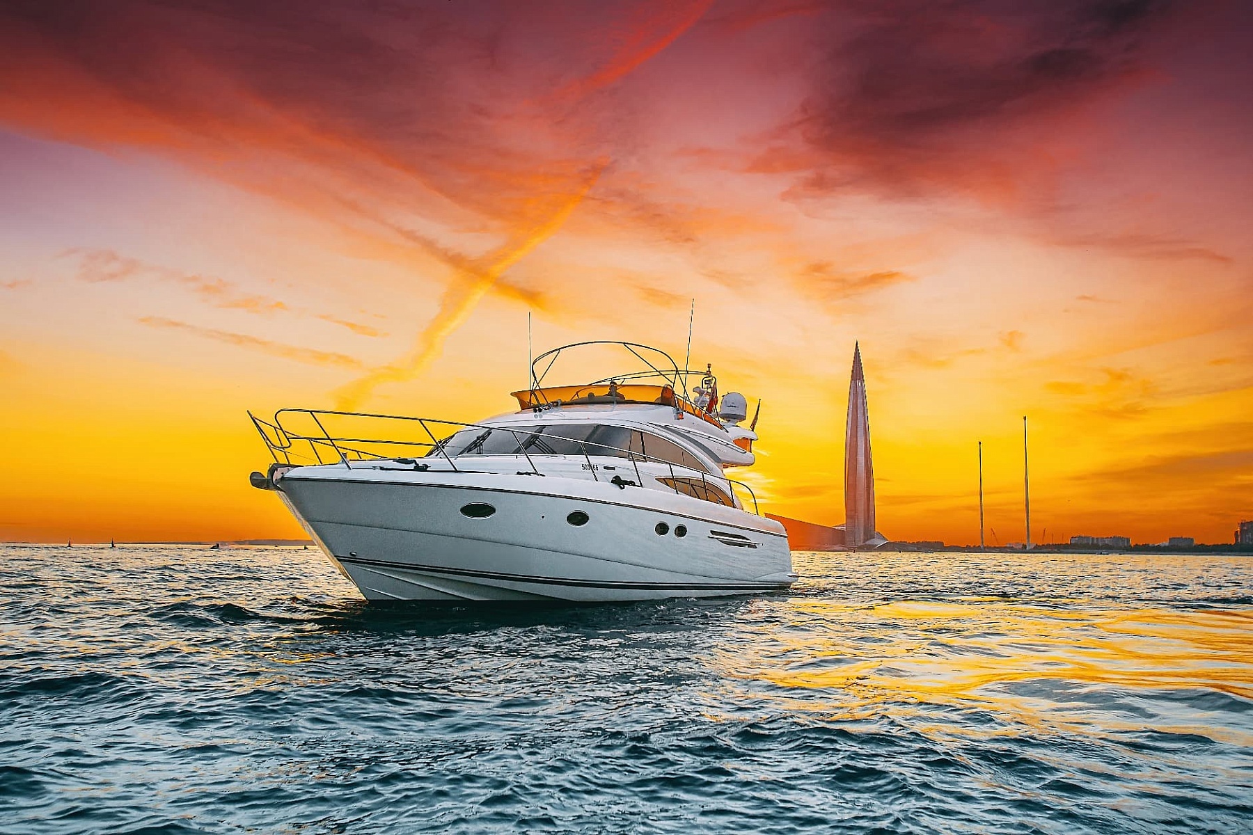 Флайбридж с шезлонгами для загара и открытая зона с диванами и столиками на втором уровне позволят насладиться свежим воздухом и шикарными видами на набережную Санкт-Петербурга. Для вашего удобства на борту оборудованы 2 уборные, душ, уютные каюты, бар, кухня, а также аудиосистема с поддержкой Bluetooth и телевизор. Все продумано до мелочей: теплые пледы, чай, кофе и питьевая вода для всех гостей.
