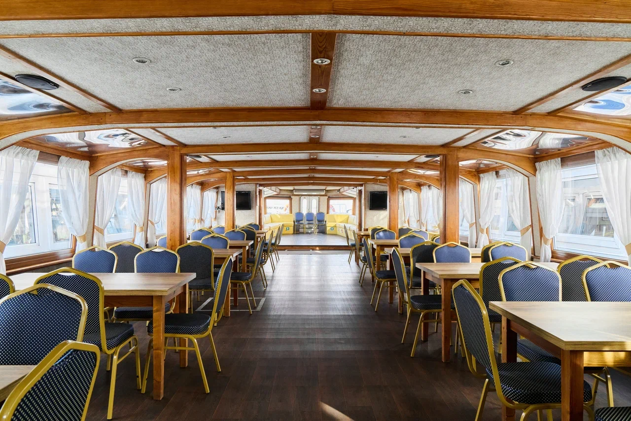 Большой и просторный зал, расположенный на нижней закрытой палубе, оформлен в светлых песочных тонах с отделкой из дерева, что придает интерьеру особый шарм и уют. По желанию клиента зал может быть оформлен в соответствии с тематикой мероприятия, что поможет создать тем самым неповторимую атмосферу праздника.