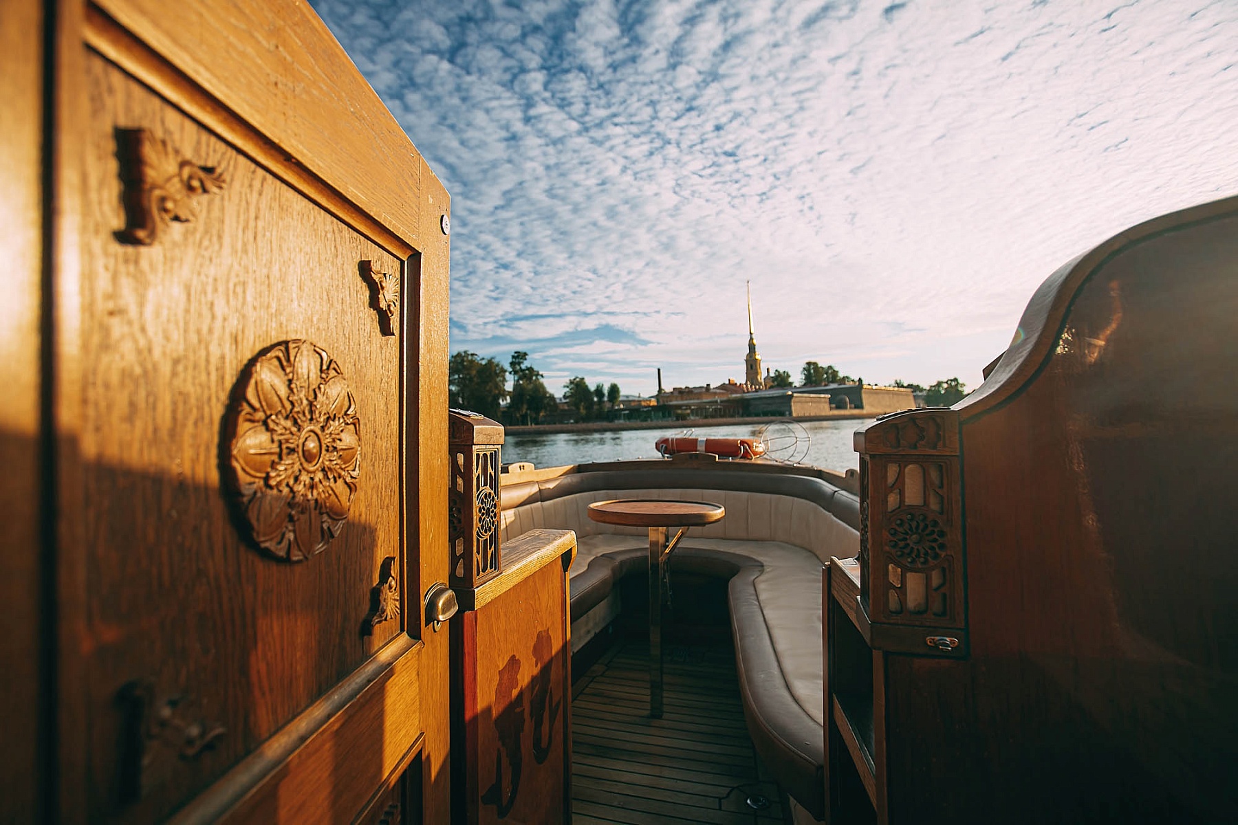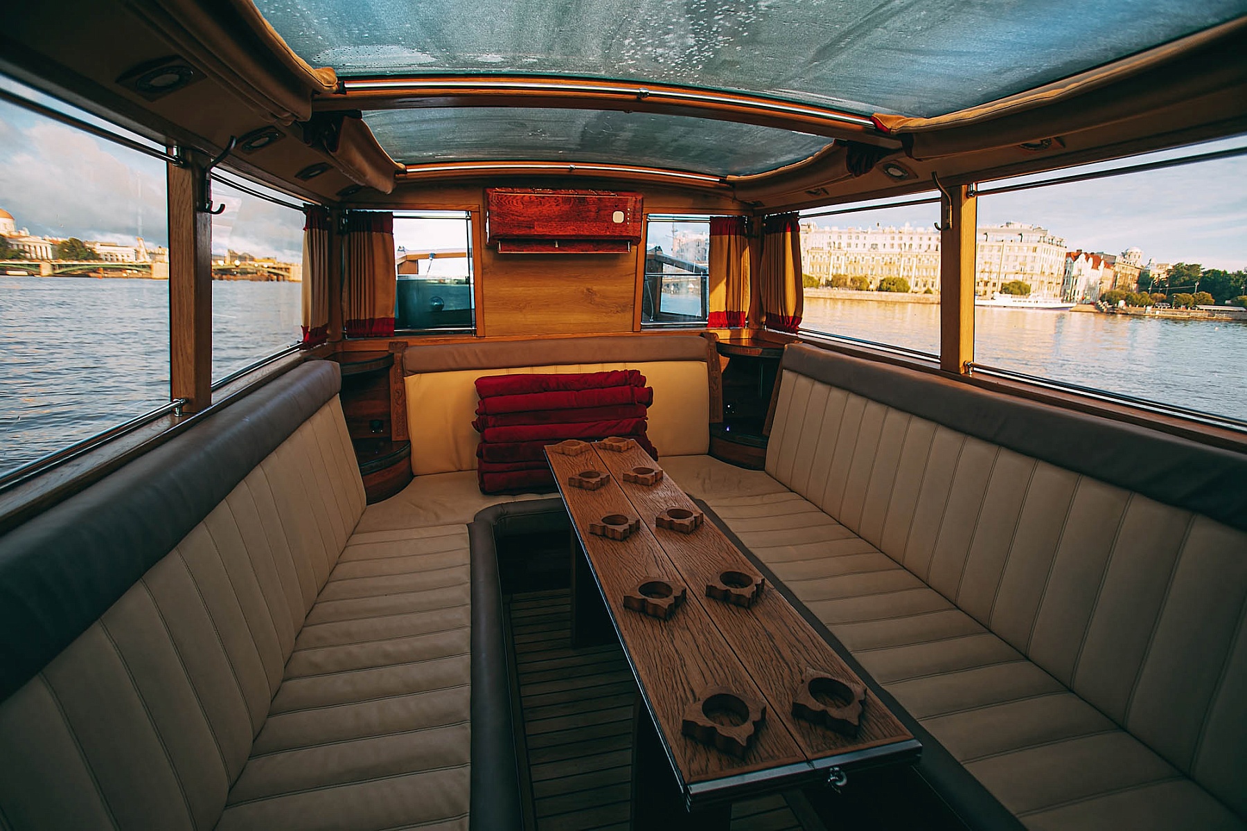 Крытый салон с кожаной мебелью позволит насладиться поездкой в любую погоду. Внутри катера есть мини-кухня для приготовления закусок, удобная уборная, а также система кондиционирования и отопления, что обеспечит комфортный отдых при любой температуре. Для развлечений на борту предусмотрен телевизор с караоке и мощная аудиосистема. Теплые пледы согреют гостей в прохладную погоду.